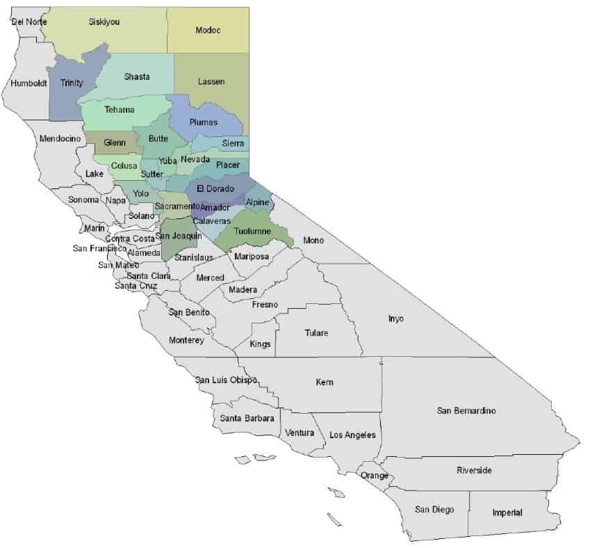 The following counties fall within the Sacramento-Shasta Chapter boundaries: Alpine, Amador, Butte, Calaveras, Colusa, El Dorado, Lassen, Modoc, Nevada, Placer, Plumas, Sacramento, San Joaquin, Shasta, Sierra, Siskiyou, Sutter, Tehama, Trinity, Tuolumne, Yolo, and Yuba